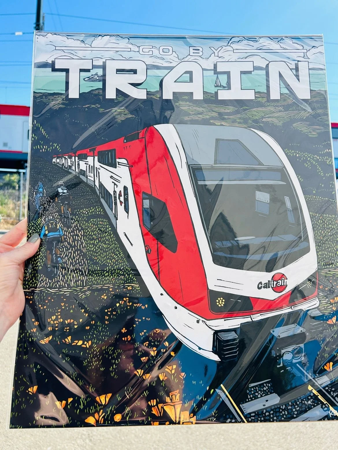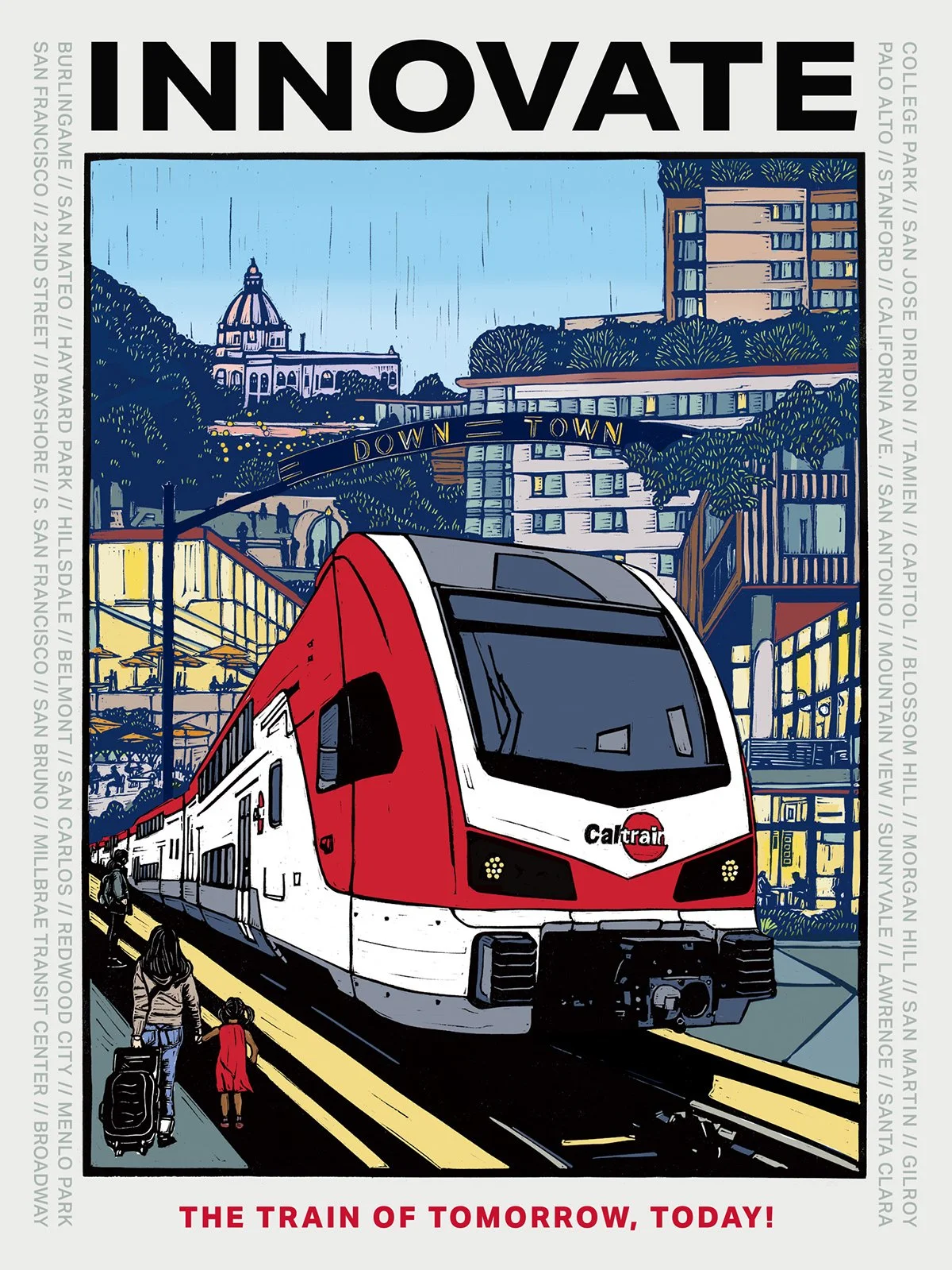 Drawing inspiration from classic travel artwork, Rewitzer crafted a series of three images showcasing the new EMU trains against backdrops emblematic of each county's essence. While Caltrain passengers zoom through Silicon Valley's tech hub, Rewitzer's creations elegantly blend traditional and modern techniques, offering commuters a nostalgic yet futuristic visual treat. The type design for this project was done by Jolene Stark, of Different Beast.